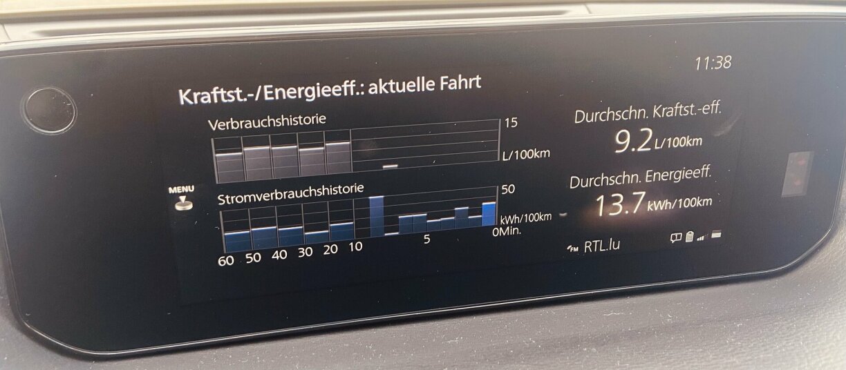 Also wann’s du am Hybrid Modus fiers an d’Batterie relativ vill iwwer Generatrice geluede gëtt, da brauch den Auto gären 9 Liter Bensinn op 100 Kilometer. Dat ass net näischt. An deem Modus bass de awer praktesch just op der Autobunn ënnerwee. Dat ass awer sécher net den Terrain de prédilection fir de Mazda e-Skyactiv R-EV. Dofir soll ee sech elo och net vun deenen 9 Liter ofschrécke loossen.