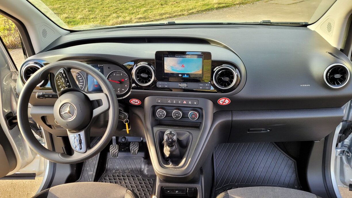 Hei mierkt een, dass Mercedes definitiv eng Schëpp drop geluecht huet. Ech erënneren drun, dass mer an der Kategorie vu klengen Notzgefierer ënnerwee sinn. An dofir wierkt z.B. den Tableau de Bord an déi verschaffte Materialien dann dach schonn zimmlech héichwäerteg. Et ass ëmmer nach Plastik, ma Veraarbechtung an Haptik sinn definitiv an där Kategorie vu Gefier ganz vir mat bäi.