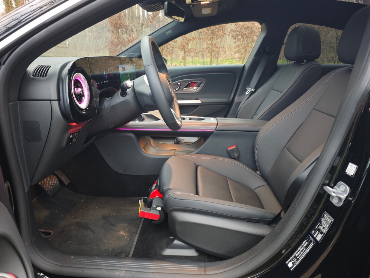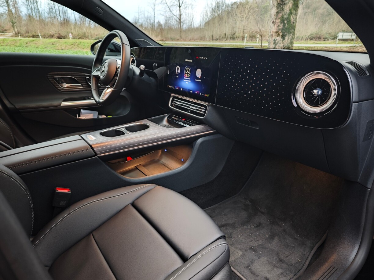 Konservativ ass den CLA nëmme vu baussen, ënnert dem Blech stécht modernst Technik, déi och mat Modeller aus China mathale kann. An dat och beim Interieur, wou déi riseg Display-Landschaft vum MBUX, also der Mercedes-Benz User Experience, dominéiert. D’Armaturebried mat den Ecrane wierkt wéi e Friemkierper, dee sech iwwert déi ganz Breet vum Auto zitt. Dat ass funktional a modern, jo, mee mat Design huet dat fir mech net méi vill ze dinn.