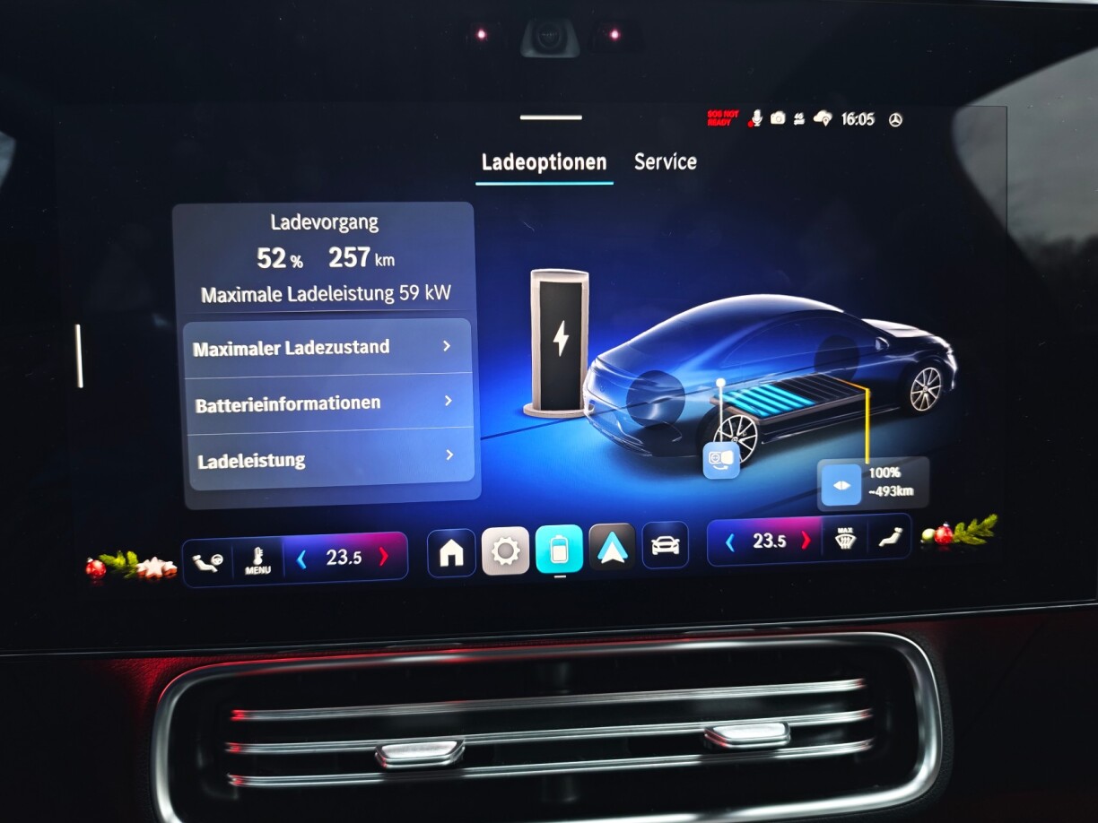 A wann déi opgebraucht sinn, luets de duerch den 800V-System vun der Batterie mat bis zu 320 kW no. Vun 10 op 80 Prozent rechent Mercedes mat gutt 20 Minutten, am Test huet d’Keelt awer d’Leeschtung limitéiert. Méi wéi 147 kW hunn ech net erreecht.