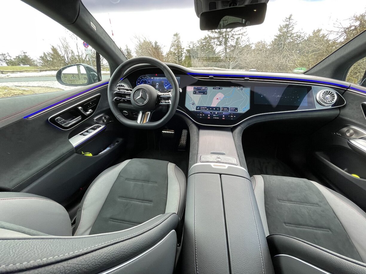 Ganzer 3 Ecranen verschmëlzen - optional wuel verstanen, mee net manner impressionnant - zu engem sougenannten Hyperscreen dee sech vum Chauffeur iwwert d’ganz Breed bis virun de Bäifuerer zitt. Vill Spillfläch also, wourop den Infotainment weise ka, wat hautdesdaags technesch alles méiglech ass. Ervirzehiewen bleift den Ecran vum Bäifuerer, deen elo iwwert dem fuere Filmer kucke kann. Luusst de Chauffeur bis eriwwer, gëtt de Schierm desaktivéiert. Houfreg ass een zu Stuttgart och op d‘„electric intelligence“ mat där de System déi spuersaamst Streck vun A op B berechent an dobäi d’Topographie, de Verkéier an d’Luetstatiounen mat abezitt. Bei esou ville Funktiounen kënnt de Chauffeur awer u seng Grenzen: zum engen hu mech déi vill Schiermer ofgelenkt, zum aneren hat ech trotz Technikinteressi meng Schwieregkeeten bis op all Schierm dat ze gesi war, wat ech wollt.