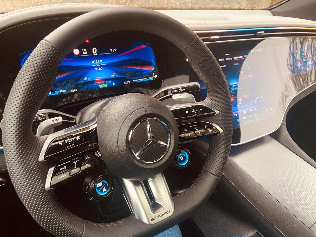 D’Äntwert ass jo. Den normalen EQE SUV hu mir op dëser Plaz schonns presentéiert. D’AMG-Versioun ass nach eng Nummer driwwer. Dat fänkt schonns am Cockpit un. Ech soe bewosst Cockpit, well et huet een d’Gefill, datt een an engem Boieng 737 sëtzt. Op 3 Display’s, déi zesummegerechent bal 1 Meter 50 breet sinn, kriss de all méiglech Informatiounen. Ech muss awer soen, datt et fir mech e bëssen iwwerdriwwen ass. Beim fuere léist de dech einfach ze gären oflenken. Manner wier an deem heite Fall méi.