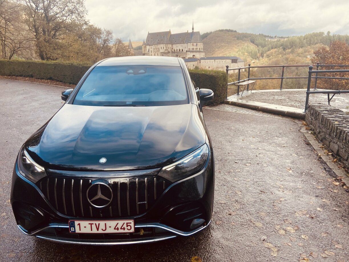2,7 Tonnen, esou vill wäit den EQE SUV, schwätzen a sech net dofir, datt ee sportlech ënnerwee ka sinn. Dat ass awer bei dësem AMG de Fall. Fir den Auto un d’Wackelen ze kréien, muss ee schonns extrem un d’Limitte goen. Ech hu mech selwer déi eng oder aner Kéier ertappt, fir mengen ze mussen an de Sportmodus ze wiesselen, fir einfach déi ganz Kapazitéit vum Auto eraus ze këddelen. De Sprint vun 0 op 100 ass a 4,3 Sekonne gemaach. Bei 210 Spëtzt ass Schluss. Déi 4 Rad ugedriwwene Maschinn, wou déi hënnescht Rieder mat bis zu 10 Grad mat lenken, loossen den Auto um Buedem reegelrecht pechen. Datt déi hënnescht Achs mat dréit, ass awer och beim Parken immens praktesch. De Wendekrees gëtt em ganzer 2 Meter méi kleng. Beim AMG ass dat esouguer gratis. Bei deenen anere Versiounen ass et eng Optioun vu ronn 1.500 Euro.