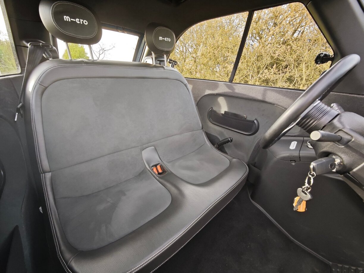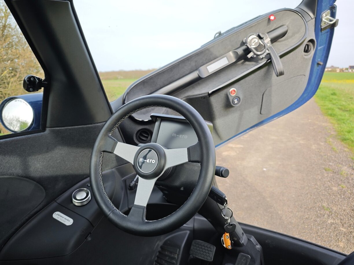 Leider manner Charme a Retro-Feeling wéi erwaart. Fir d’Gewiicht am Grëff ze hale gëtt am Microlino op alles verzicht, wat net onbedéngt néideg oder virgeschriwwen ass. Et gëtt keng Klimaanlag, mee just eng Lüftung, keen agebaute Radio mee e portabelen Bluetooth-Lautsprecher an nach net emol e Réckspigel un der Frontscheif, mee nëmmen déi zwee mini-kleng Réckspigelen lénks a riets.