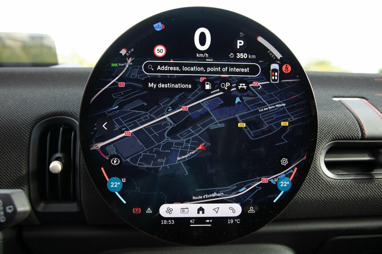 An op deem spillt sech praktesch déi ganz Kommunikatioun mam Auto of. Knäppercher gëtt et bal keng méi. Ma esou chic wéi den Ecran ass, esou onpraktesch ass e mat Momenter: d’Auerzäit ass winzeg kleng an engem Eck verstoppt, déi ugangs witzeg Animatioune beim Wiessel vun der „Experience“ (also dem Fuermodus) nerven iergendwann, a wann den Handy sech och no der X-te Kéier net automatesch verbënnt… da wënscht ee sech en Update.