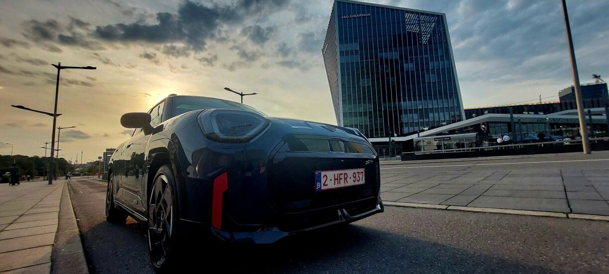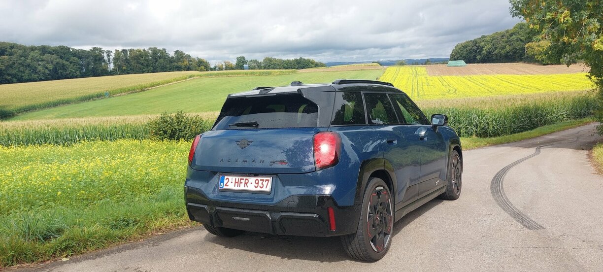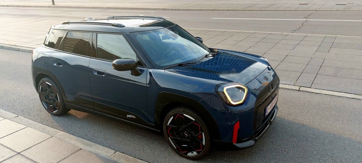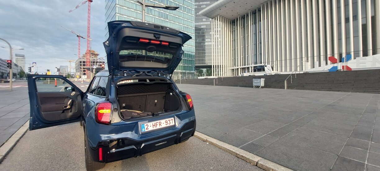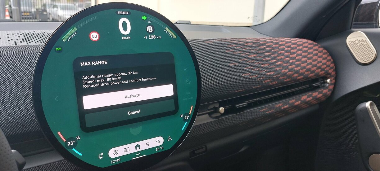 Mee de Launometer schléit positiv aus, well Fuerwierk a Lenkung, Gokart-Feeling opkomme loossen. Zemools wann de roude Boost-Knäppche gedréckt gëtt. Da gëtt et fir 10 Sekonne nach en extra Schub. An da vergësst een definitiv, dass dee Mini elo 1,8 Tonnen op d’Wo bréngt. Jo E-Modeller weie vill, och wann hei just eng 54 kw/h Batterie an den Asaz kënnt. Mam Resultat, dass de Fuerspaass dach séier eriwwer ka sinn. No 300 Kilometer sollt e keng Luedstatioun oder Steckdous méi ignoréieren a sécherheetshallwer an de MAX Range Modus goen, fir da mat reduzéierte Confort-Funktiounen a maximal 90 km/h heem ze kommen.