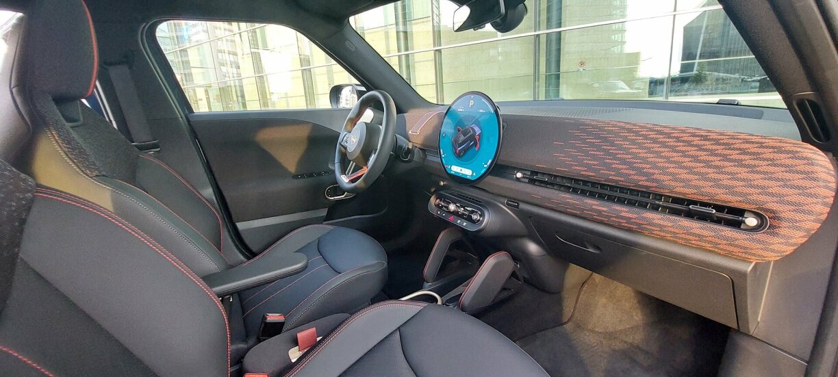 Also bannenan presentéiert sech de Mini Aceman JCW ganz chic, mat sportlechen Ambitiounen, a ville klengen Detailer déi sech iwwer d’Armaturebried zéien. Sportsëtzer mat guddem Säitenhalt an de Kéieren. D’Fuerwierk ass zwar net knëppelhaart, mee iwwer de Stroossebelag kréie Chauffer a Passagéier awer vill mat.