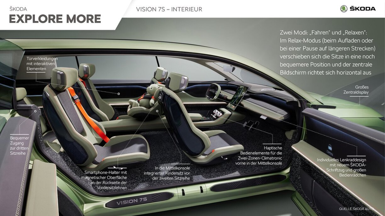 Wéi vill vun der Studie herno an dem reale Modell wäert ëmgesat ginn, muss d’Zukunft weisen, ma Skoda wëll sech sengem Motto trei bleiwen, an deen heescht «Simply clever». Een Element dovunner sinn divers magnéitesch Elementer am Auto. Sief et fir d’Passagéier hannen am Auto, déi hiren Handy sou um Sëtz viru sech kënne festmaachen fir eng optimal Siicht op den Ecran… Sief et fir d’metalle Gedrénksfläsch ënnert dem Tableau de Bord ze verstauen oder och nach magnéitesch Rucksäck, déi zum Equipement vum VISION 7S gehéieren an iwwerall kënne matgeholl ginn. Fir all Elementer vum Vision 7S elo hei opzezielen, dat géif de Kader sprengen. Dir kënnt iech et awer an eiser Fotosgalerie ukucken.