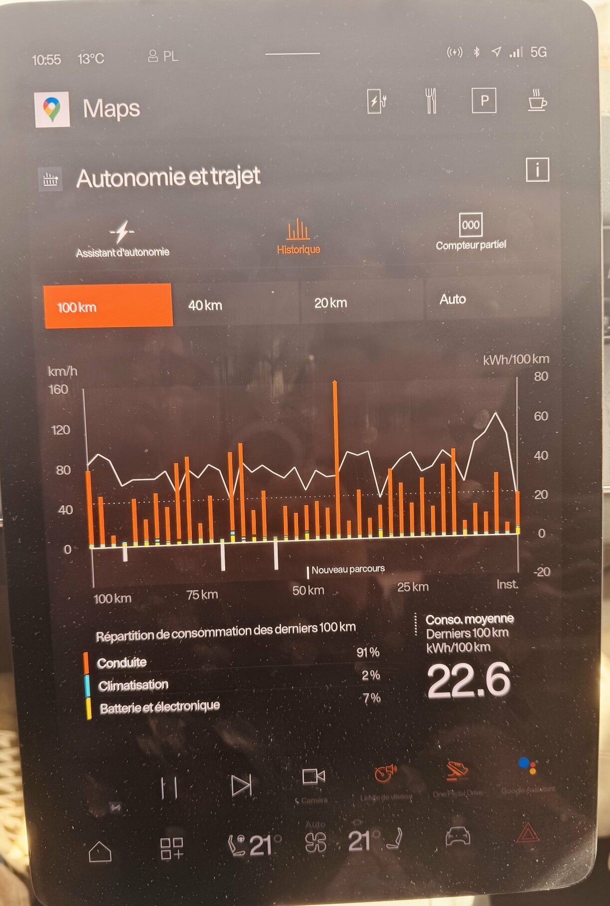 Wat elo d’Autonomie ugeet. Polestar gëtt 706 Kilometer fir de Long Range Single Motor un. 636 fir den Long Range Dual Motor a 567 fir de Longe Range Dual Motor mam Performance Pack. Ech hat den Auto mam Performance Pack, do schwätze mir vu 517 Päerd. Mäi Verbrauch louch bei 22,6 kWh. Dat ass, wann een d’Gewiicht (2.6 Tonnen) an d’Leeschtung vum Auto kuckt, ee ganz acceptabelen Wäert. Déi reell Autonomie louch bei mir, bei relativ kalen Temperaturen, bei 440 Kilometer.