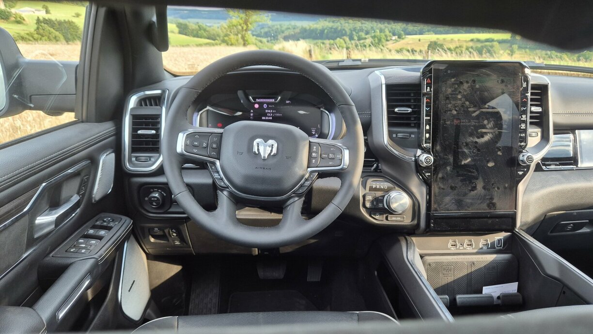 Am Banneraum muss ech soen, fënnt een och wierklech alles wat ee brauch. Plazen, fir eppes néierzeleeën, fënnt een der méi wéi ee brauch, an do deels och wierklech grouss Gefaacher, wou een och grouss Waasserfläsche kann dra verschwanne loossen. E grousse 14,4 Zoll Display fir den Navi, Panoramadaach mat Schiebedaach-Funktioun, Wireless-Charger, gutt Soundanlag mat 19 Lautsprecher vun Harman Kardon, bequeem Sëtzer asw. hate mer zum Beispill an eisem Testmodell, deen an d’Ausstattungsgamm “Laramie” hat.