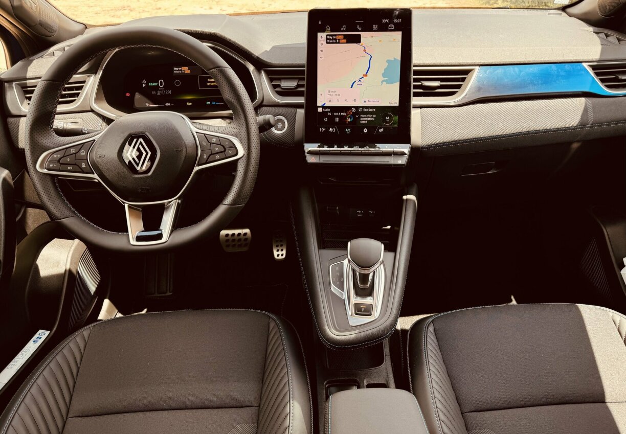 Fir dat Segment, respektiv däi Präisklass, ass de Captur ganz uerdentlech verschafft. Den haarde Plastik ass deelweis nach do, deelweis ass en awer och opgescheimt, wat der Optik zegutt kënnt. Apropos Optik. Dominéiert gëtt déi vun engem 9,3 Zoll Display, dee liicht an d’Richtung vum Chauffeur gedréit ass. Wat mir gutt gefall huet ass de Faite, datt een d’Heizung nach kann iwwer normal Knäppercher bedéngen an net iwwer den Display muss maachen, wéi mëttlerweil bei villen aneren Autoen. D’Sëtzer sinn ok, kéinten awer e bësse méi Halt bidden.
