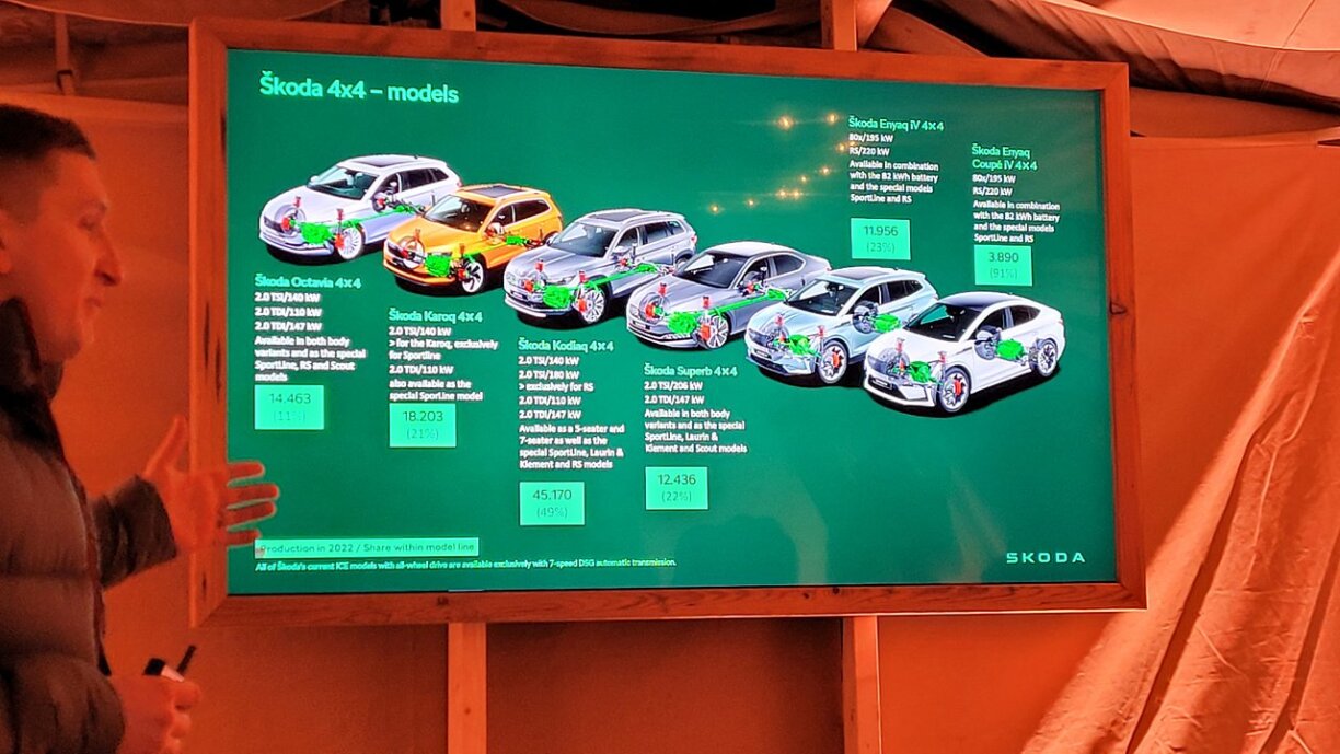 Gefuer si mer op Skoda Octavia, Superb, Karoq, Kodiaq an op den elektresch ugedriwwenen Enyaq-Modeller. Den Ënnerscheed vum Verbrenner op den Elektro-Auto war trotz ënnerschiddlechem Konzept, duerch eng clever Software, net sou grouss wéi ech mer et erwaart hätt, wéi och den Instrukter Per Johannson erkläert huet.