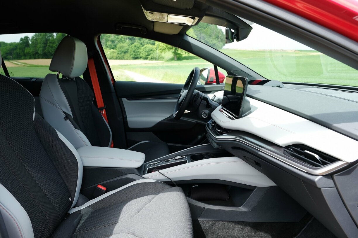 Fir mech ee vun den Highlights; trotz senge relativ kompakte Moossen ass den Elroq immens lëfteg a geraimeg. Kapp a Beefräiheet gëtt et genuch, de Sëtzconfort ass exzellent an a punkto Design huet Skoda richteg gutt geschafft. Agreabel unzepaken an puer faarweg Akzenter a Form vu Konschtliederiwwerzich um Tableau oder knallrout Gurten sinn einfach sympathesch, genee esou wéi déi typesch praktesch orientéiert Gimmicks wéi de Präbbeli an der Chauffersdier oder Accessoiren fir d’Mall ze organiséieren.