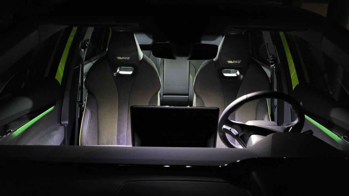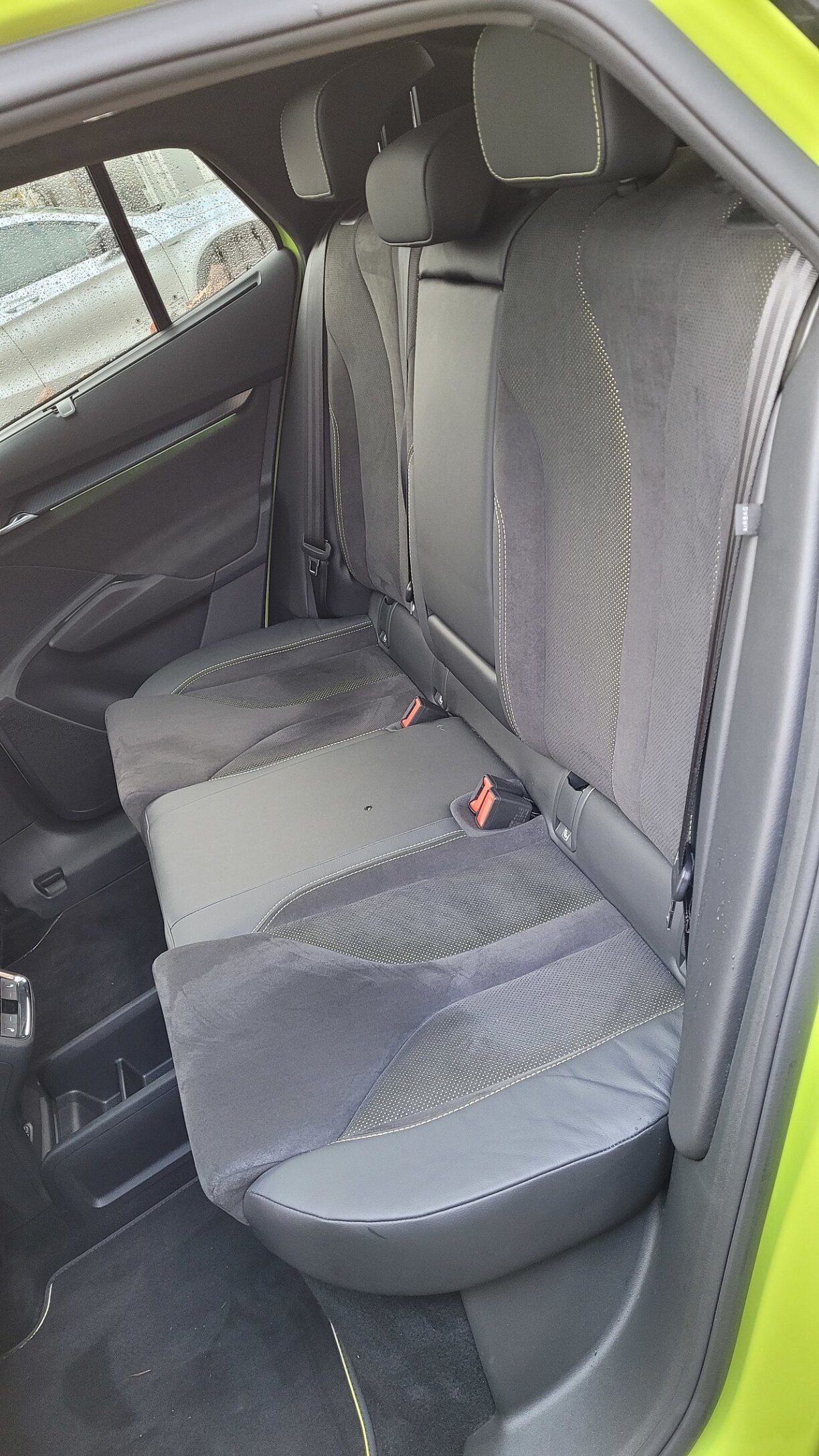 Ech hat liicht bedenke wat d’Plazverhältnisser am Enyaq RS ugeet, well et schliisslech e Coupé ass. Ëmsou méi positiv iwwerrascht war ech um Enn. Ech hat kuerzerhand 2 Kolleegen hannen an déi zweet Rei gesat, déi béid ëm 1m90 grouss waren. Iwwert hirem Kapp hate se nach ëmmer puer Zentimeter Plaz, an och d’Been hunn net musse gequetscht ginn. Grousse Pluspunkt also.