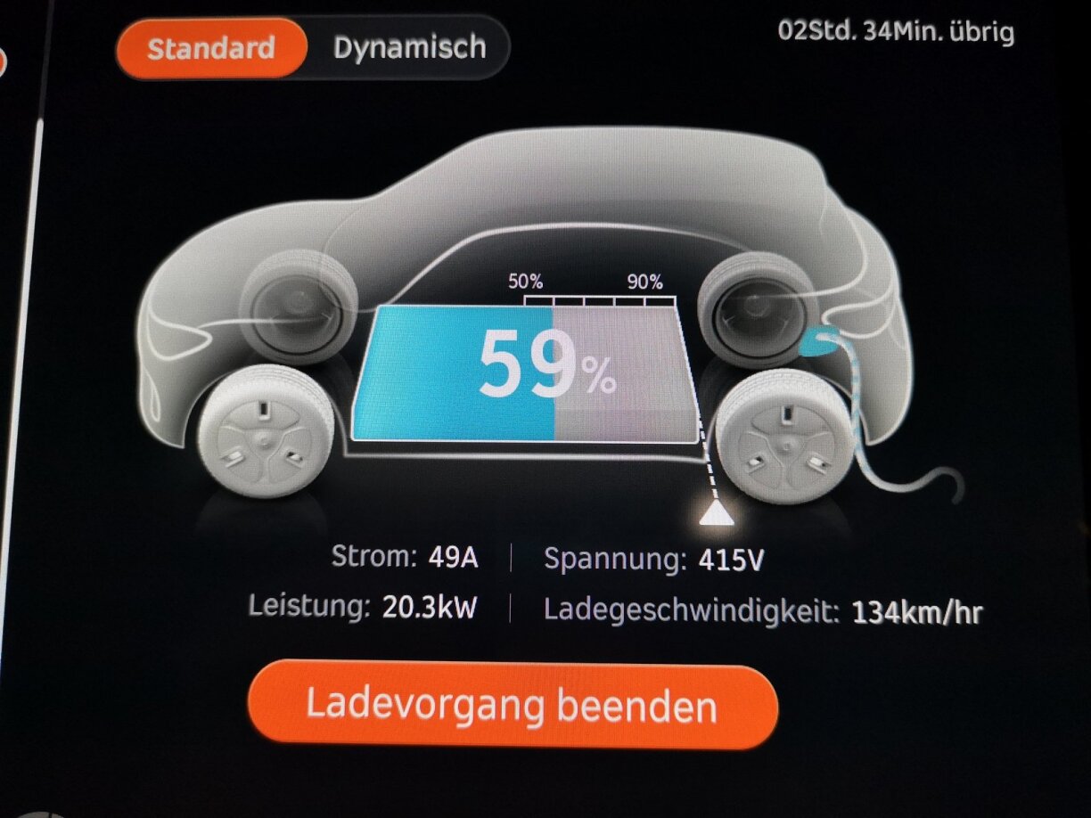 Genee, awer a kenger Hisiicht méi mam Virgänger ze vergläichen. Endlech huet ee Leeschtung a Form vu minimum 272 PS an eng brauchbar Autonomie vu gutt iwwer 300 km! Dat huet mech ugestiwwelt, mol bis op Stuttgart ze fueren, mat iwwer 400 km Autonomie sollt dat jo méiglech sinn. 150 kW Luedleeschtung maachen dann och eng Tëschecharge zum kuerze Pleséier. Dat war d’Theorie; an der Praxis ass de smart duuschtereg. Och am Ultra-Gaspedal-Heemelmodus sinn et, allerdéngs och bei Temperaturen ëm de Gefréierpunkt, Minimum 19 kW-Stonnen, voll ofgetrëppelt 30. Do ass d’Autonomie natierlech séier fleeten.