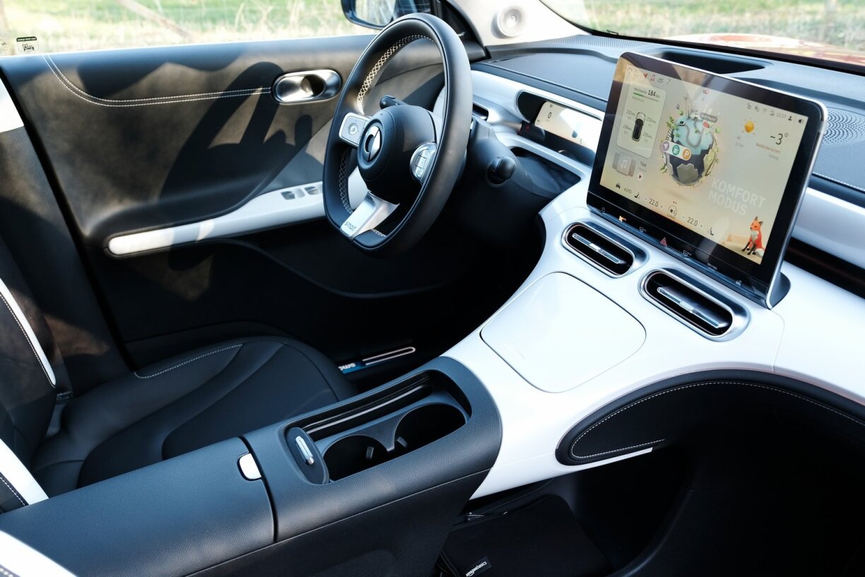 Ma déi chic a breet Konsol engt schonn emol d’Knéifräiheet an, jiddefalls huet mäi rietse Knéi stänneg dru geschauert. Opfälleg an agreabel ass dee groussen 12-Zoll-Schierm, genee wéi dee méi klengen a gestache schaarfen Display virum Chauffer. Wéi esou üblech goufen d’Knäppercher staark reduzéiert a mussen alleguer am Haaptmenü gesicht ginn, leider och déi vun der Spigelverstellung. Den Assistent, ee klenge Fuuss riets ënnen um Schierm reagéiert op Sproochbefeeler à la “Hey smart”, allerdéngs och net ëmmer. Soss mécht de smart keng Schwieregkeeten; au contraire: Sëtzpositioun an Iwwersiicht sinn tipptopp, just no hanne schif eraus mécht den Design engem d’Liewe méi schwéier. Mee dofir ginn et jo wéi ëmmer Kameraen.