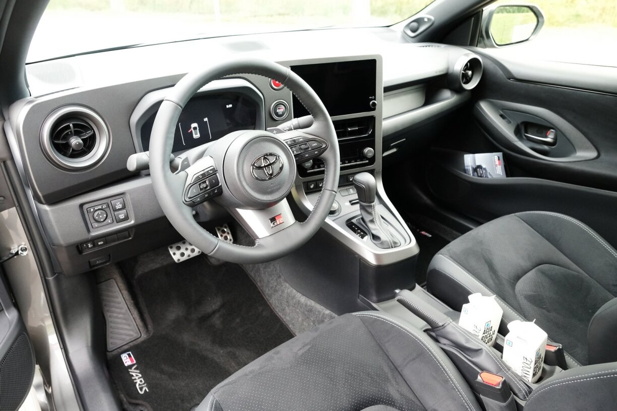 De GR Yaris bäisst sech mam Allrad richteg an den Asphalt, huet dohier null Problemer seng Leeschtung op d’Strooss ze kréien. De 1600er Dräizylinder gëtt bei 3000 Toure richteg waakreg a stemmt säi vollt Dréimoment op de Vilbrequin, just de Klang gefält mir perséinlech elo net immens. Getréischt ass een awer direkt wann een entweder zum Schalthiewel gräift oder déi nei Automatik d’Gäng wiessele léisst. A béide Fall passen d’Uschlëss gutt, maache Spaass wéinst der knackeger Féierung oder de séiere Gangwiessel. Just d’Paddelen wollten heiansdo meng Wënsch net ëmsetzen. Dofir huet de Chassis mat sengen Talenter getréischt; um Circuit du Laquais bei Lyon grad wéi op de Landstroosse war ech fir mäi Gefill awer scho spektakulär ënnerwee, mee warscheinlech nach wäit vum Grenzberäich ewech. Dat ganzt ëmmer mat engem zougedréckten A vun de Fuerwierksspezialiste wann den Hënneschten fir de klengen Adrenalinkick emol liicht wibbeleg gouf. Vu Langweil op jidde Fall keng Spuer an alt erëm de Beweis, dass kleng a liicht dacks de Garant fir Fuerspass ka sinn.