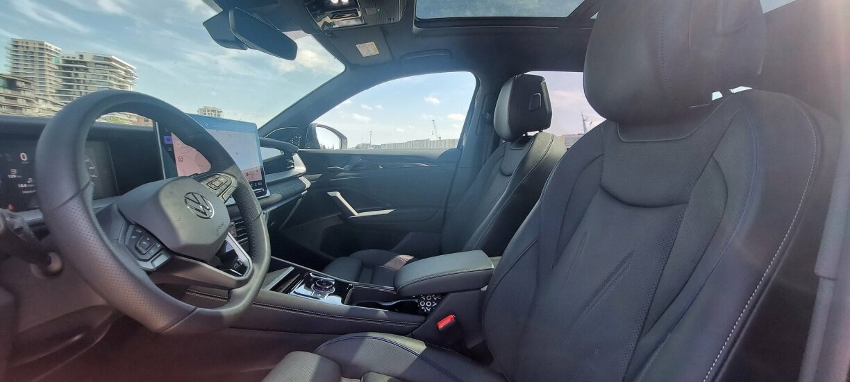 Den Tayron sonnert sech och am Interieur vum Tiguan of, mat vill Luxus Richtung Premium-Segment orientéiert. D’Veraarbechtung ass gutt, kaum haarde Plastik. E speziellt akustescht Glas reduzéiert den Dezibel bannenan. Do spréngt e ganz groussen 15 Zoll Ecran an d’A, iwwert dee quasi alles regléiert gëtt. Bei Connectivity, Infodivertissement, inklusiv Voice Assistant mat ChatGPT ass ee gutt ënnerwee, an duerch e laange Radstand a Massagesëtzer och ganz confortabel.