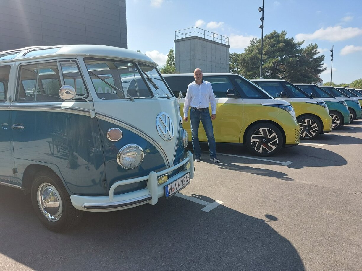 De VW ID. Buzz. “Icon reloaded” dohier, well mam ID. Buzz gëtt sech direkt un de VW T1 vu viru 70 Joer erënnert. An esou een aus der VW Oldtimer Kollektioun war dann och gläich mat ugereest. Sympathesch, praktesch, elektresch, dat ass de VW ID Buzz anno 2022.