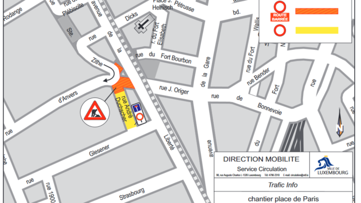 La Ville de Luxembourg tient à informer les citoyens ainsi que les usagers de la route que dans le cadre du chantier mené par la société LUXTRAM pour le réaménagement de la place de Paris, des travaux de voirie auront lieu du dimanche 18 avril 2021 (12h00) au vendredi 18 juin 2021 (17h00).