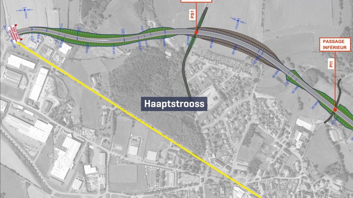 Duerch déi aktuell Strooss soll spéider keen Transit méi fueren. 4 Kilometer laang gëtt de Contournement a verleeft op 3 Bunnen. 4 Brécken an een Tunnel ginn och gebaut.