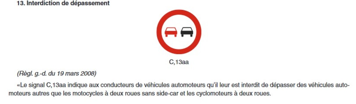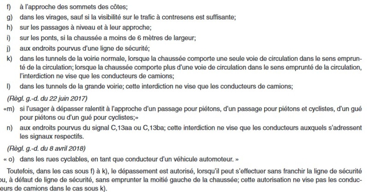 Et kann een also e Vëlo iwwerhuelen, well dat ass kee Véhicule automoteur. (E Moto däerf een och iwwerhuelen, sofern en 1-spuereg ass, ouni side-car). Mee et duerf een net iwwert d’Sécherheetslinn fueren.