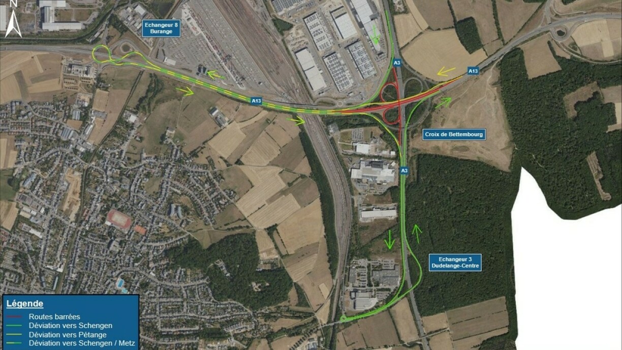 Le trafic en provenance de l’A13 vers Pétange et en direction de l’A3 en direction de Metz est dévié à partir de la croix de Bettembourg via l’A13, l’échangeur Burange, l’A13 et la croix de Bettembourg.