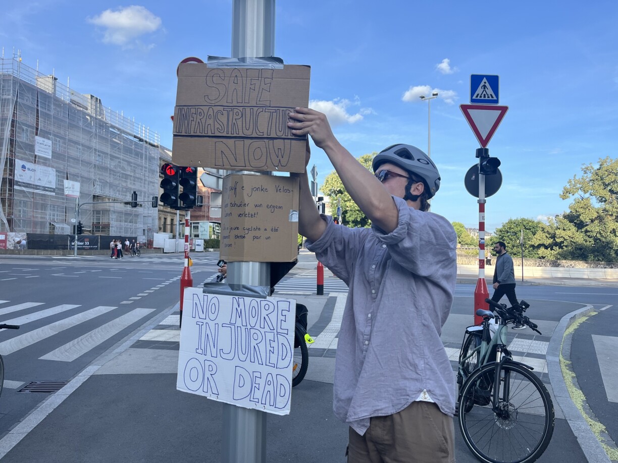Eng gutt 50 Cyclisten a Vëlosfrënn waren um Donneschdeg den Owend bei der Gëlle Fra, fir op Geforen a Problemer vun der Vëlosinfrastruktur opmierksam ze maachen. Zënter Mäerz gouf et an der Avenue Marie-Thérèse zwee Accidenter mat schwéier blesséierte Cyclisten – eemol gouf et eng Kollisioun tëscht zwee Cyclisten an déi zweete Kéier sinn e Vëlosfuerer an e Camion aneneegerannt. Dat mécht ville Cycliste Suergen.