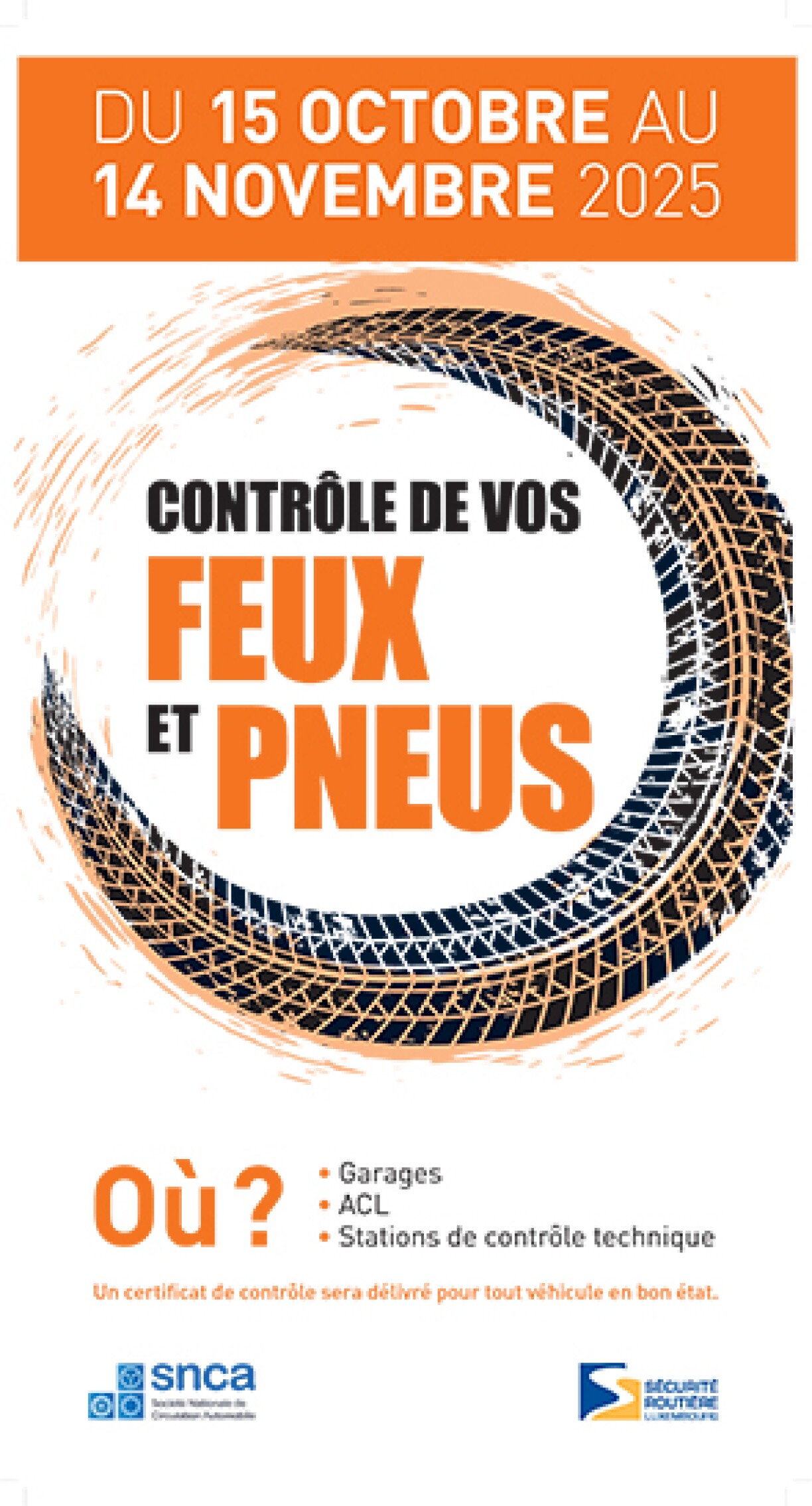 Vum 15. Oktober bis de 14. November bidde Garagen, Kontrollstatiounen an den ACL dëse Service un. Am Kader vun der Preventiounscampagne fir d’Sécurité Routière wäert d’Police bis Enn Dezember verstäerkt Kontrolle maachen, ob d’Pneuen de Wieder- a Stroosseverhältnisser entspriechen an ob d’Luuchte funktionéieren.
