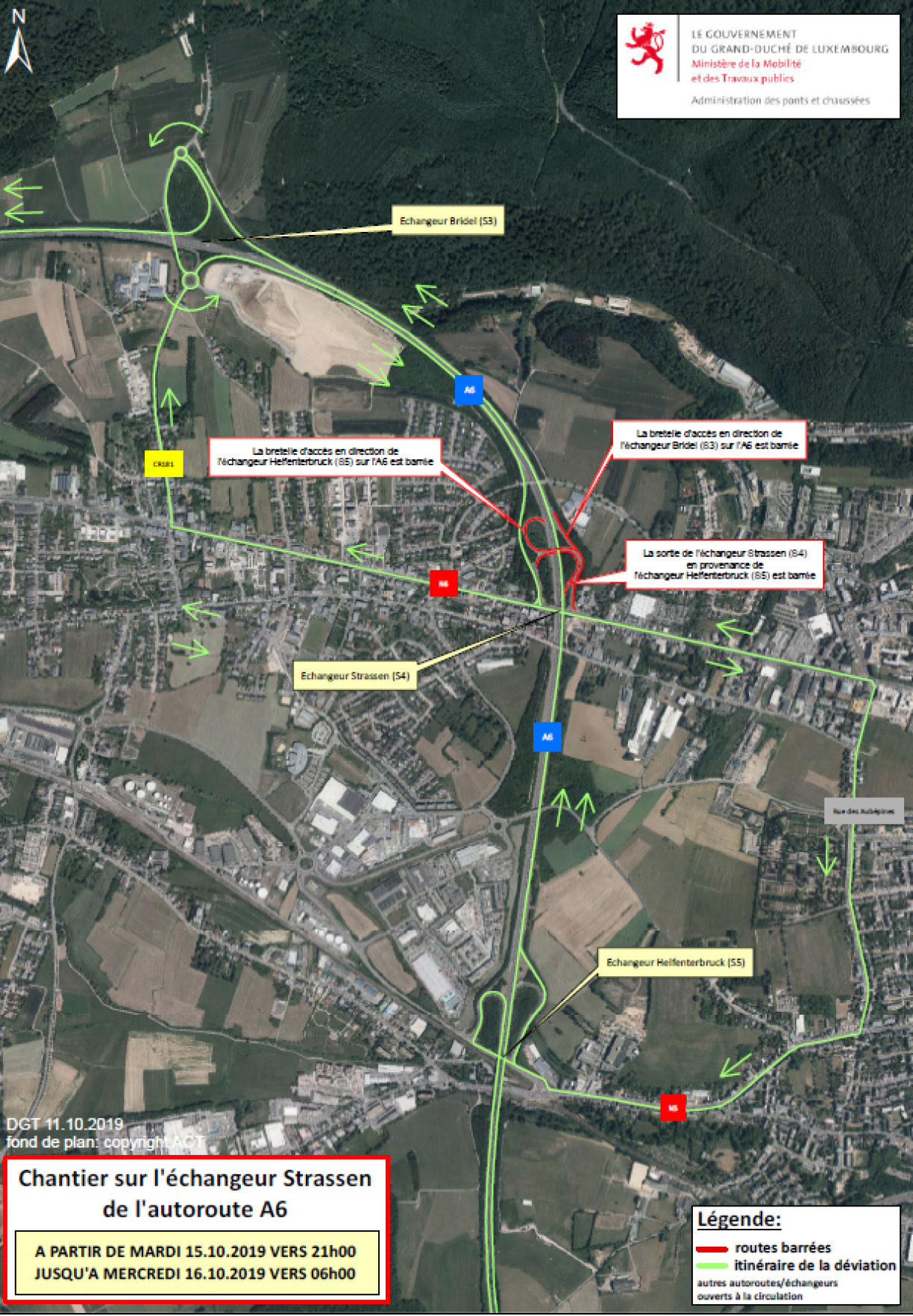 L’Administration des ponts et chaussées procédera à la fermeture de la bretelle d’accès de l’échangeur Strassen (S4) vers l’A6 en provenance de la N6 et la bretelle de sortie en provenance de l’échangeur Helfenterbruck (S5) dans le cadre des travaux de l’aménagement de l’échangeur A6/N6 et de la réhabilitation des ouvrages O.A. 1007 et O.A. 1036 du mardi 15 octobre 2019 vers 21 heures jusqu’au mercredi 16 octobre 2019 vers 6 heures.