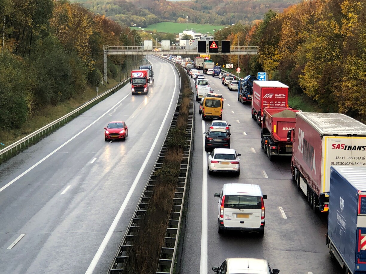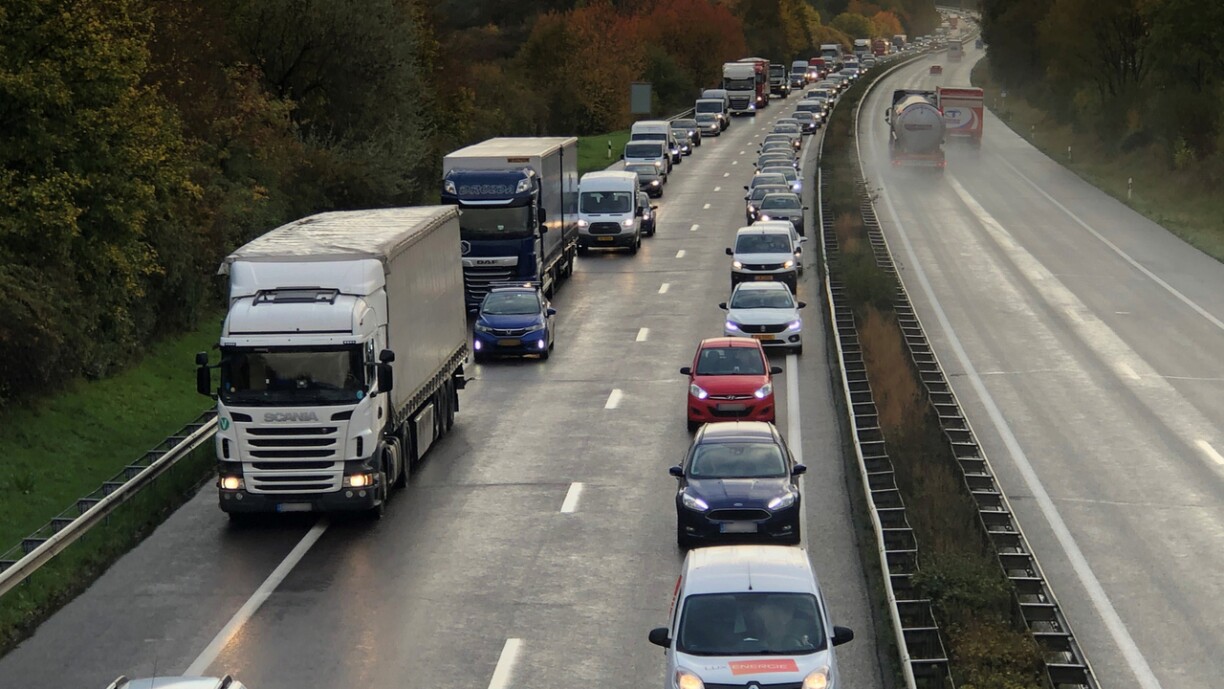 D’Iwwerhuelspuer war blockéiert an et ass schlecht laanscht gaangen. Géint 8 Auer war de Stau scho 14 Kilometer laang.
