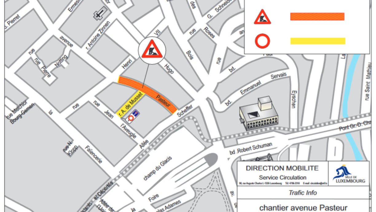 La Ville de Luxembourg tient à informer les citoyens ainsi que les usagers de la route que dans le cadre des travaux d’aménagement d’une piste cyclable bidirectionnelle dans l’avenue Pasteur, la circulation sera adaptée comme suit du 21 mai 2022 à 7h00 au 27 mai 2022 à 13h00 :