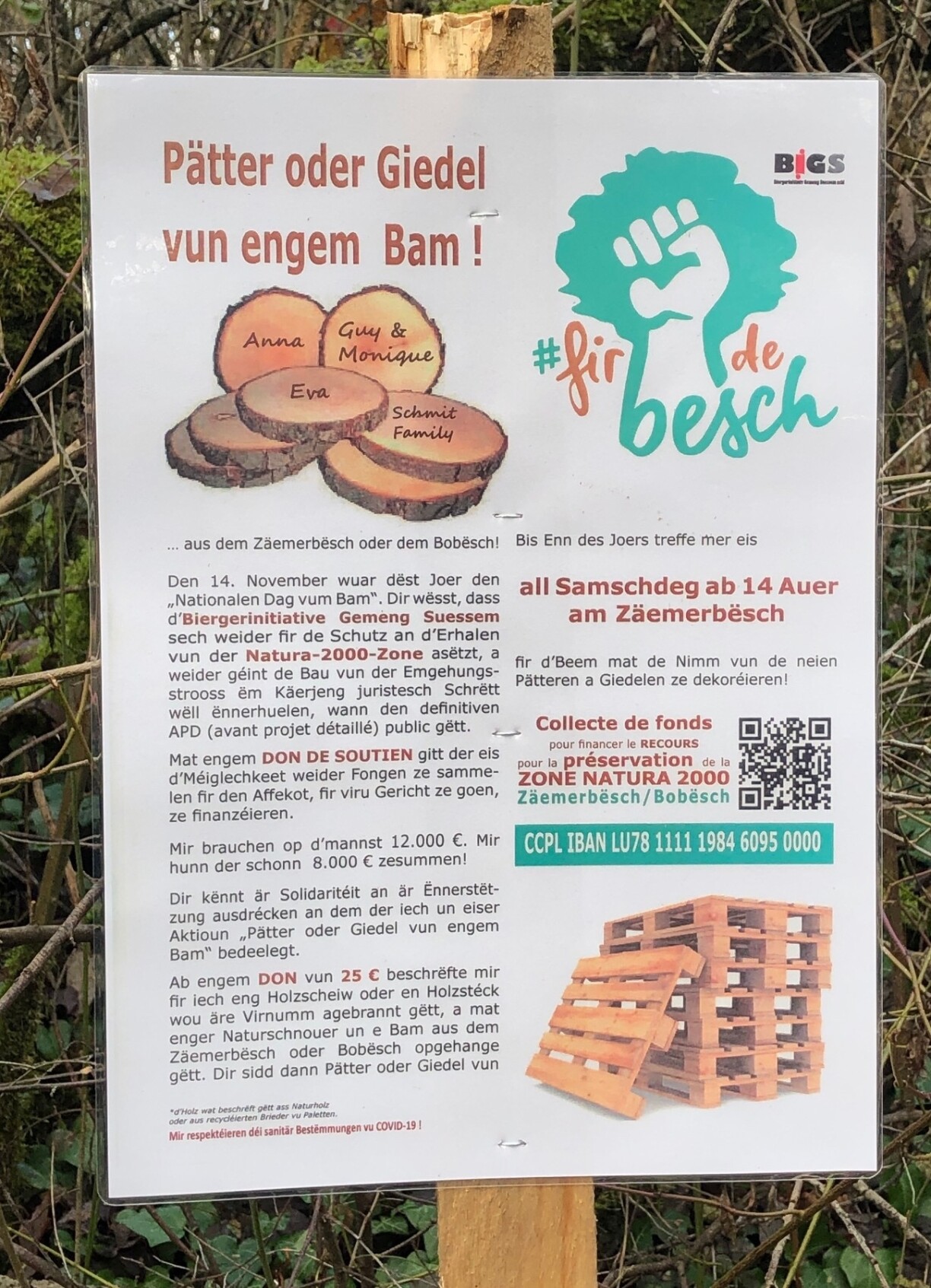Mat der Aktioun “Pätter oder Giedel vun engem Bam” setzt sech d’Biergerinitiativ Gemeng Suessem weider fir d’Erhale vum Zäemerbësch an, dee jo dem Contournement vu Käerjeng soll zum Affer falen.