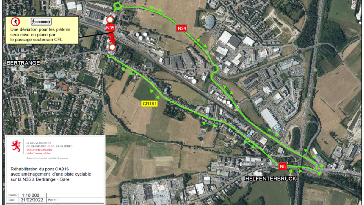 Bonne nouvelle pour les usagers de la route passant par Bertrange: le pont ferroviaire OA816, après des travaux de réhabilitation et l’aménagement d’une piste cyclable, sera accessible à nouveau dans les 2 sens à partir du lundi 14 mars 2022 à 6 heures. Auparavant, afin de réaliser les travaux de finition, la route nationale N35 sera barrée à toute circulation sur le tronçon entre le giratoire côté Strassen et le giratoire côté Bertrange du vendredi 11 mars 2022 à 19 heures au lundi 14 mars 2022 à 6 heures. Une déviation passant par Helfenterbruck (N34 - N5 - CR181) sera mise en place. Le tronçon en question sera également barré pour les piétons et les cyclistes. Ils seront déviés sous la gare CFL par le passage souterrain existant. |