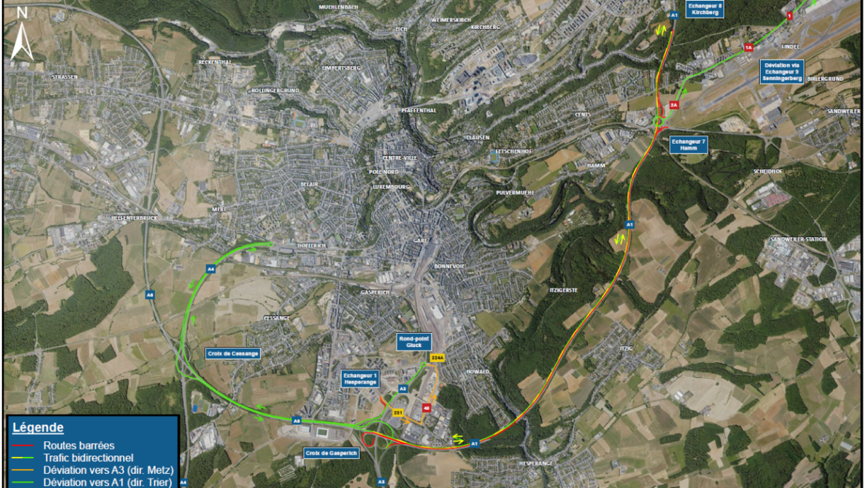 Wéinst dem Chantier ass d’Streck a Richtung Tréier tëscht dem Gaasperecher Kräiz an dem Echangeur Kierchbierg zou. Den Trafic leeft bidirektional iwwert déi aner Spuer. Dowéinst gëtt hei d’Vitess och op 70 Kilometer an der Stonn an an den Tunnellen esouguer op 50 km/h limitéiert.