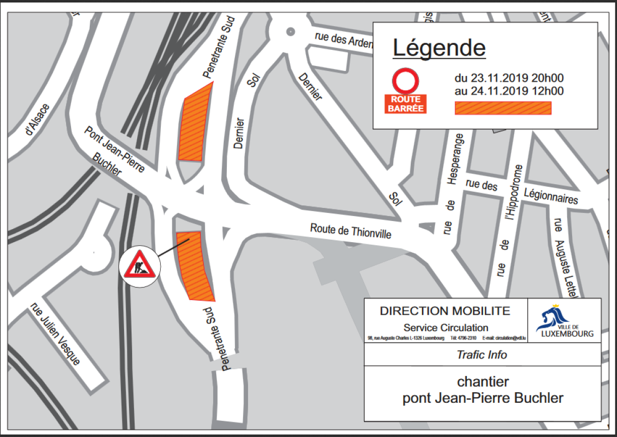 La Ville de Luxembourg et l’Administration des Ponts et Chaussées tiennent à informer les citoyens et les usagers de la route que des travaux de démolition d’une partie de la dalle en béton du pont Buchler au-dessus de la Pénétrante Sud seront entamés du 23 au 24 novembre 2019. Ces travaux impliqueront les modifications de la circulation suivantes :