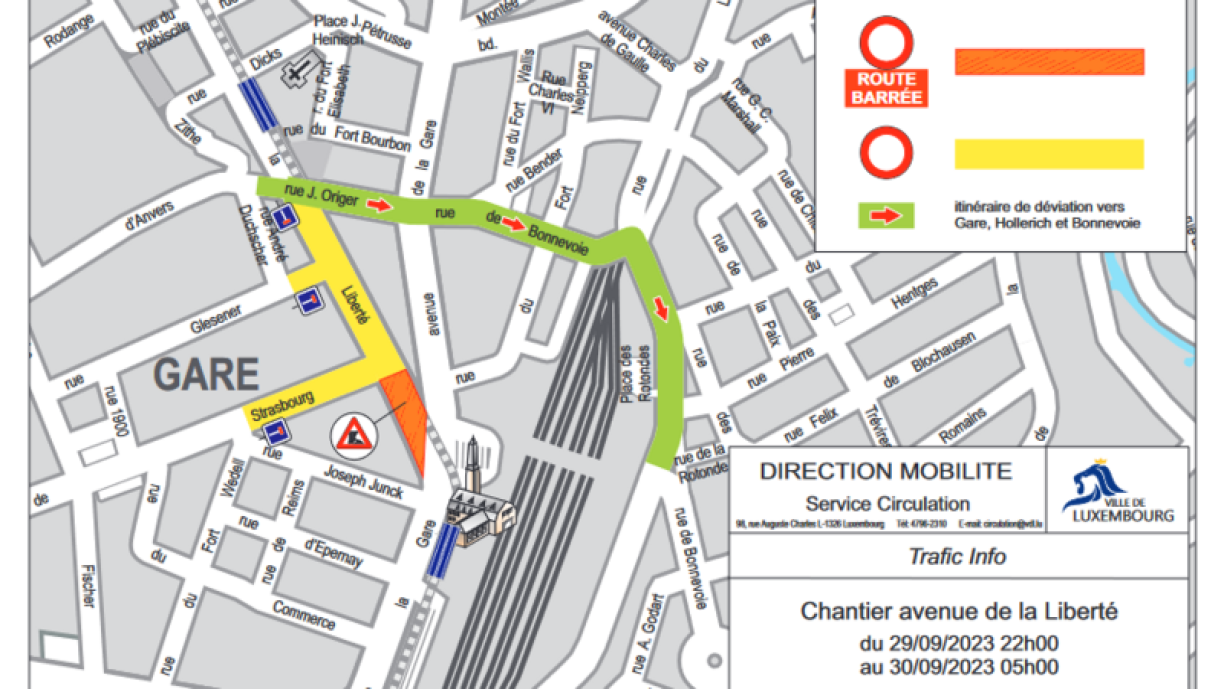 De Chantier an der Avenue de la Gare ass den 1. Oktober vu 7 bis 17 Auer. Wärend den Aarbechten ass d’Strooss tëscht der Boulevard de la Pétrusse an der Rue Jean Origer gespaart. Dëse Chantier huet och en Impakt op den ëffentlechen Transport, dat bei de Linnen 2, 4, 5, 9, 10, 13, 14, 18, 23 an 29.