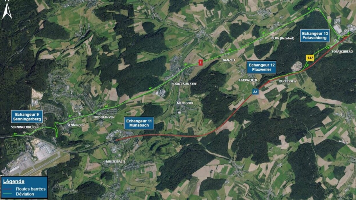 Le trafic en provenance de l’A1 et en direction de Gasperich est dévié à partir de l’échangeur Potaschberg via la N1 jusqu’à l’échangeur Senningerberg. Le trafic en provenance du CR142 et en direction de l’A1 vers Gasperich est dévié à partir de l’échangeur Flaxweiler via le CR142 et la N1 jusqu’à l’échangeur Senningerberg. |