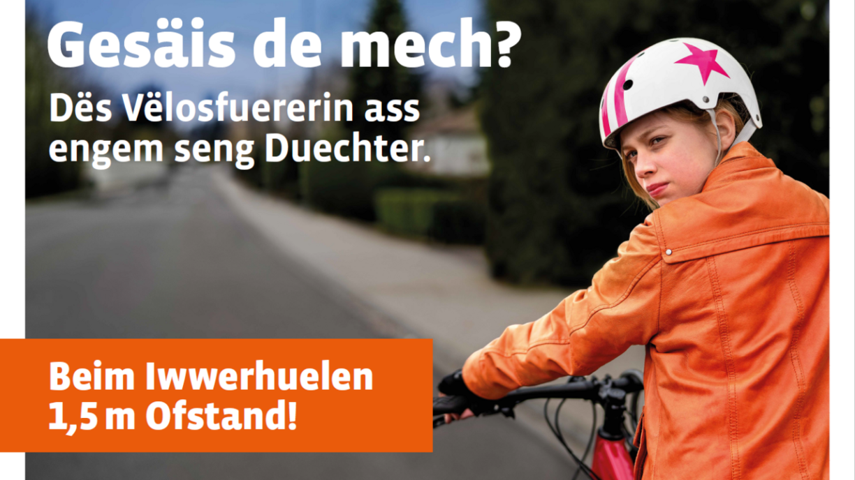 D’Vëlofueren ass an de leschte Joren ëmmer méi beléift ginn, sief et an der Fräizäit oder och als Verkéiersmëttel. Mä d’Zuel vun den Accidenter an déi Cycliste verwéckelt sinn, klëmmt och, zejoert goufen et 27 Schwéierverletzter an een Doudegen. Fir den Cyclisten eng awer eng gewësse Sécherheet kënnen ze garantéieren, huet den Transportministere zesumme mat der Sécurité routière an der Police elo eng nei Sensibiliséierungscampagne lancéiert. Dës dréit de Numm “Gesäis de mech? Beim Iwwerhuelen 1,5m Ofstand.” Se soll drun erënneren, datt Autoe beim Iwwerhuelen op d’mannst annerhallwe Meter Distanz zum Vëlo hale sollen.