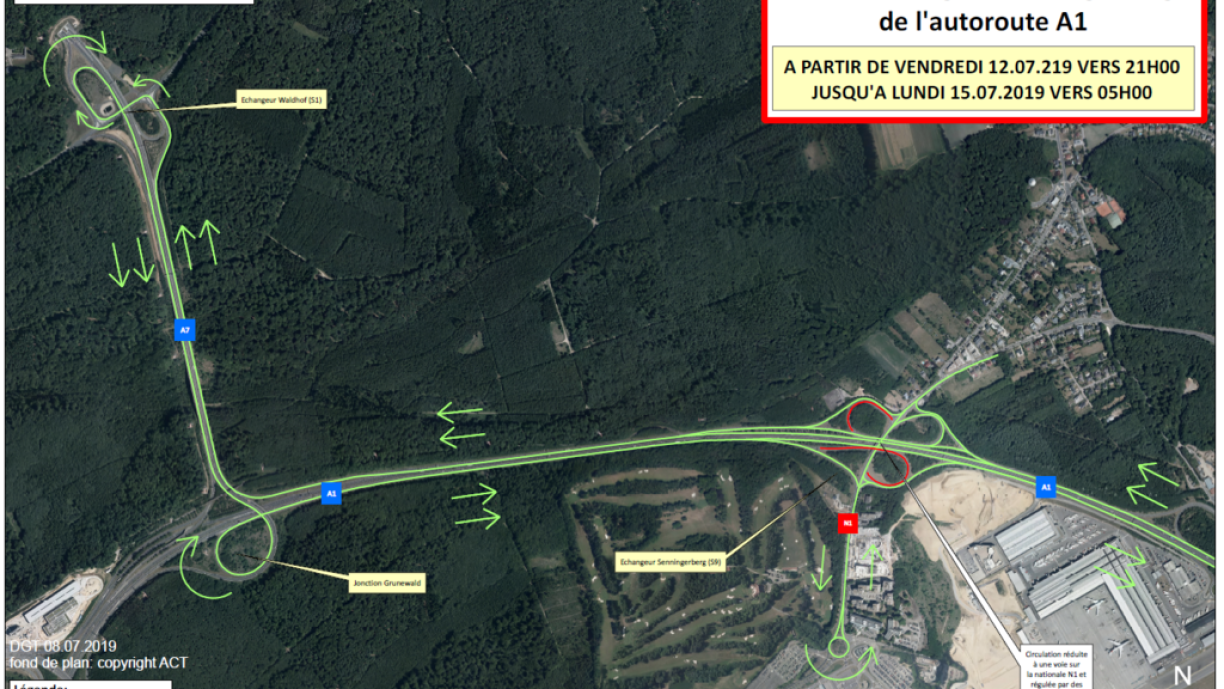 Aus Richtung Tréier kënnt een net méi direkt op de “Findel”. Do leeft d’Deviatioun iwwert d’Jonctioun Gréngewald, d’A7, den Echangeur Waldhaff an dann zeréck iwwer d’A7 an d’A1 op de Findel.