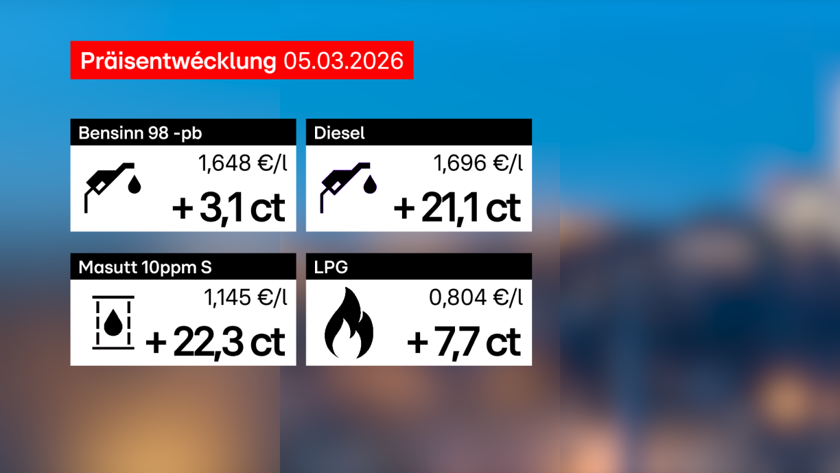 Den 98er Bensinn gëtt ëm 3,1 Cent méi deier a wäert domat vun en Donneschdeg Hallefnuecht un 1,648 Euro pro Liter kaschten. Op eng massiv Präishausse musse sech all déi Leit astellen, déi Diesel tanken: Hei klëmmt de Präis ëm 21,1 Cent vun 1,485 op 1,696 Euro pro Liter. Eng änlech Präishausse ass et beim Masutt, deen ëm 22,3 Cent méi deier gëtt an domat 1,145 Euro pro Liter kaschte wäert, amplaz wéi bis elo 0,922 Euro pro Liter.