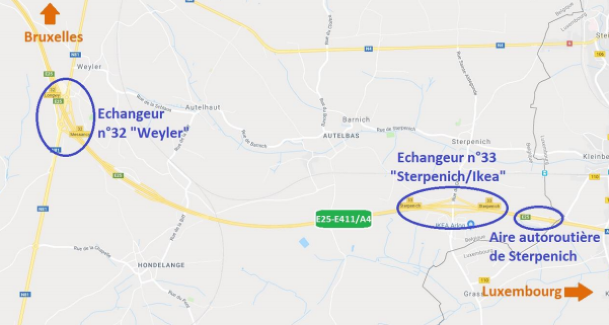Op der Sortie n°32 kann een net erausfueren, dofir sollen d’Chauffeure weider a Richtung Lëtzebuerg fueren an do d’Sortie Sterpenech huelen. Duerno solle se Demi-tour maachen an d’Sortie n°32 an Direktioun Bréissel huelen.