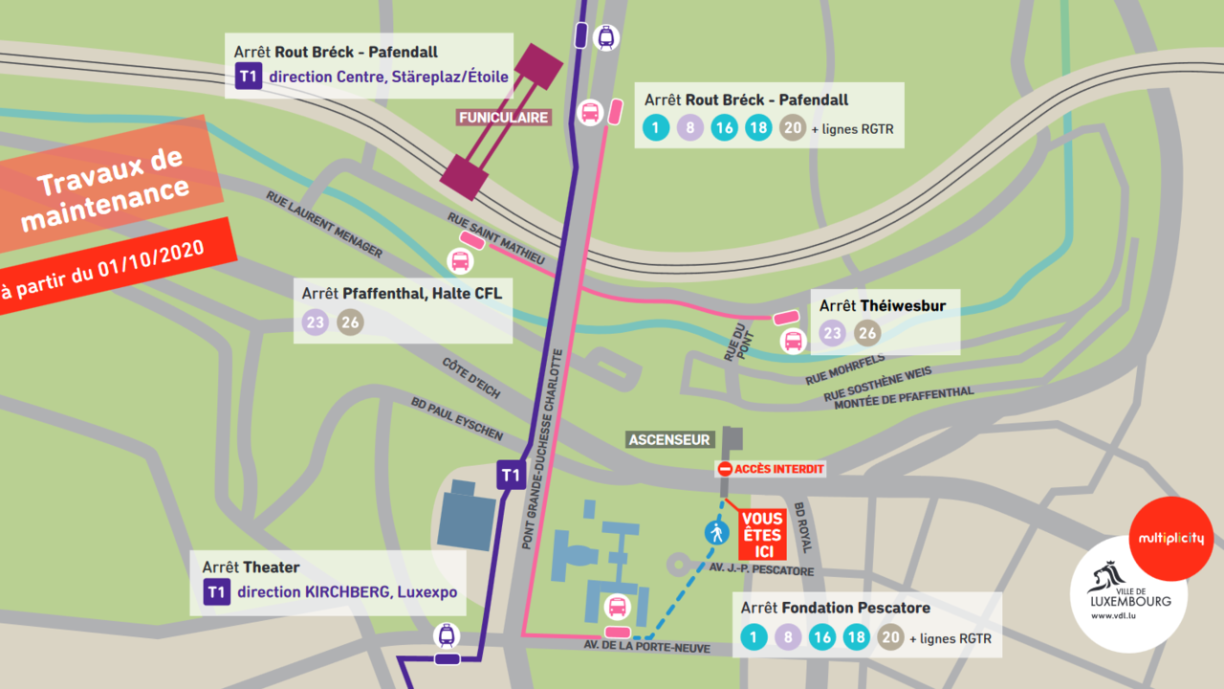 La Ville de Luxembourg tient à informer le public que l’ascenseur reliant le Pfaffenthal à la Ville Haute sera hors service à partir du jeudi 1er octobre 2020, 19h, et cela pour une durée d’environ deux semaines en raison de travaux de maintenance. L’intervention vise à remplacer les câbles de traction et les roulements de la machine de traction dont l’état est régulièrement examiné afin de garantir la qualité de l’expérience des utilisateurs.