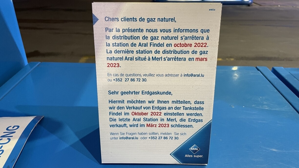 Dat confirméiert de Romain Hoffmann, Administrateur délégué vun Aral Luxembourg. Zanter der virleschter Regierung wier voll op Elektromobilitéit gesat ginn, dofir wier et bei CNG net zu engem Succès komm, wat ee bedauere géing. Et hätt een d’Clientë viru fënnef Joer informéiert, datt een nach fënnef Joer laang zwou Statiounen, eng um Findel bis Oktober 2022 an eben déi zu Märel bis Mäerz 2023 bedreiwe géing. Sou sollten d’Clientë genuch Zäit kréien, fir sech ëmzestellen. Op der Tankstell zu Märel wäert een nach bis Enn Mäerz respektiv Ufank Abrëll Äerdgas tanke kënnen, wann déi bëssi eegewëlleg Pompelen da wëllen. Duerno wäert et keng ëffentlech zougänglech CNG-Tankstell méi zu Lëtzebuerg ginn.