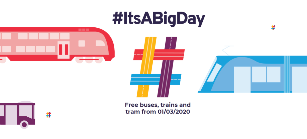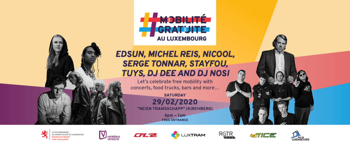 Vum 1. Mäerz un ass den ëffentlechen Transport zu Lëtzebuerg gratis. Den Transportministère organiséiert zesumme mat allen Acteuren den 29. Februar e grousst Fest a Form vu Mini-Concerten am Tram, Zich a Bus daagsiwwer an owes am Neien Tramsschapp um Serra e grousse Concert mat 2 Bünen mam Serge Tonnar, Michel Reis, Edsun, Nicool, Stayfou, Tuys an DJ’s… den Entrée owes ass gratis. Foodtrucks a Bars asw, alles do.”