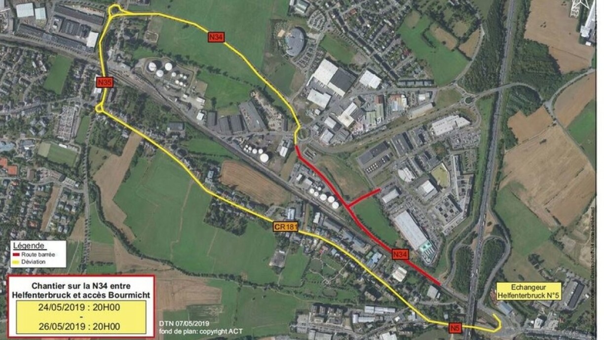 Fermeture de la N34 entre Helfenterbruck et Bertrange (24-26.5.2019)