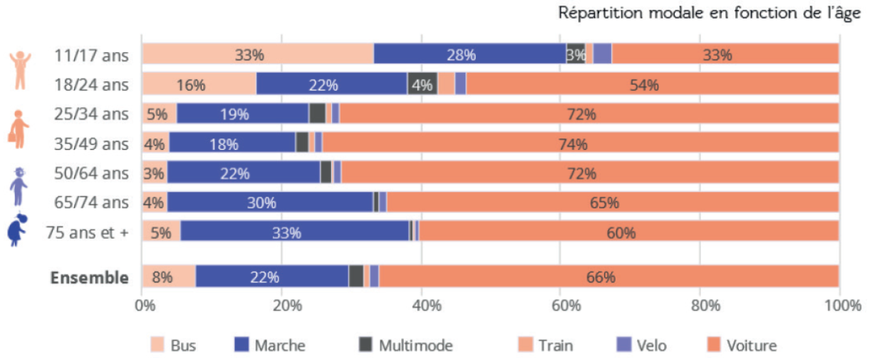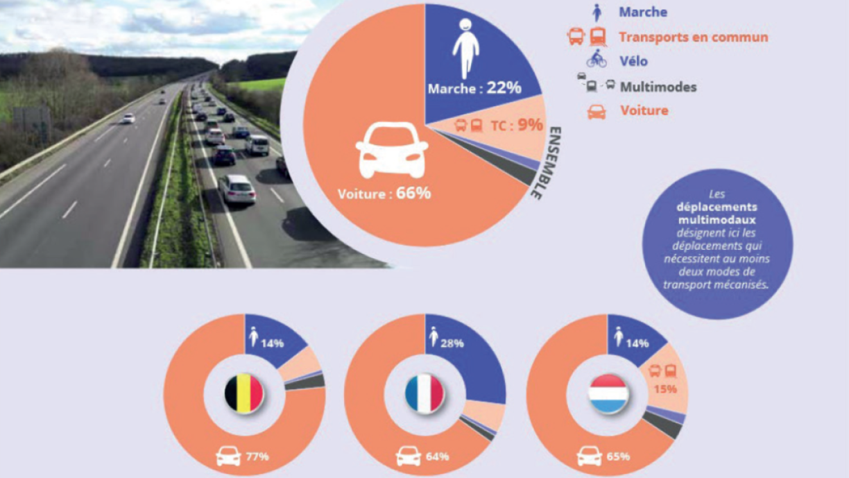 Fir 66% vun allen Trajete gëtt den Auto geholl, ee Fënneftel geschitt zu Fouss. Nëmmen all zéngten Deplacement an der Groussregioun geschitt mam ëffentlechen Transport.