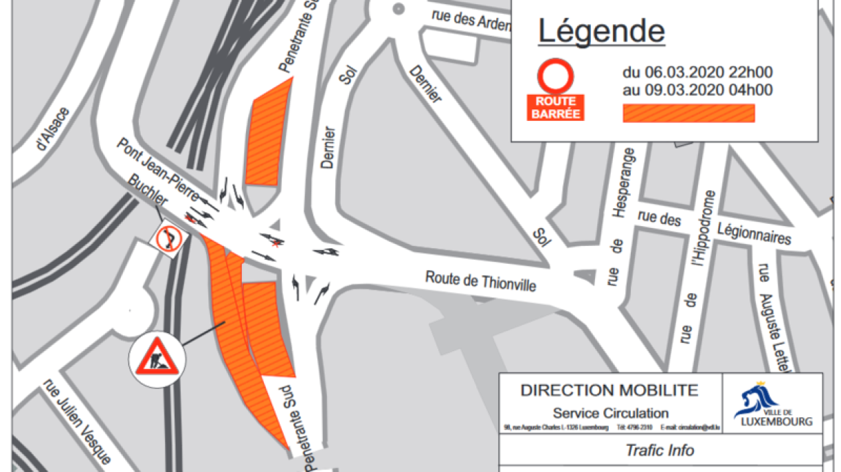 La Ville de Luxembourg et l’Administration des ponts et chaussées tiennent à informer les citoyens et les usagers de la route que des travaux pour la pose d’une charpente métallique au-dessus de la Pénétrante Sud, dans le cadre du chantier de réaménagement du pont Buchler, seront entamés du 6 au 9 mars 2020.