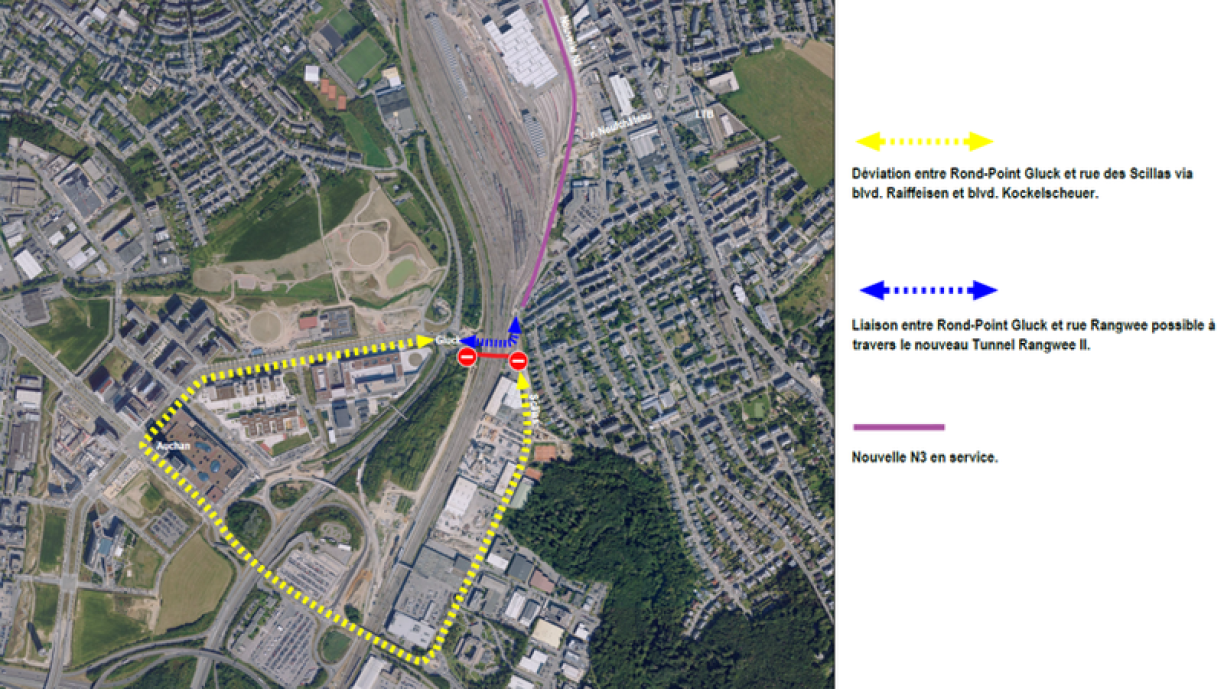 Och d’Verbindung tëschent dem neie Boulevard de Kyiv an dem genannte Rond-point geet fir den Trafic op. Am Kader vun der Arrivée vum Tram deplacéiere sech d’Reamenagementsaarbechten dann an d’Rue des Scillas op den Houwald, dës Strooss wäert fir eng Zäit zur Sakgaass ginn.