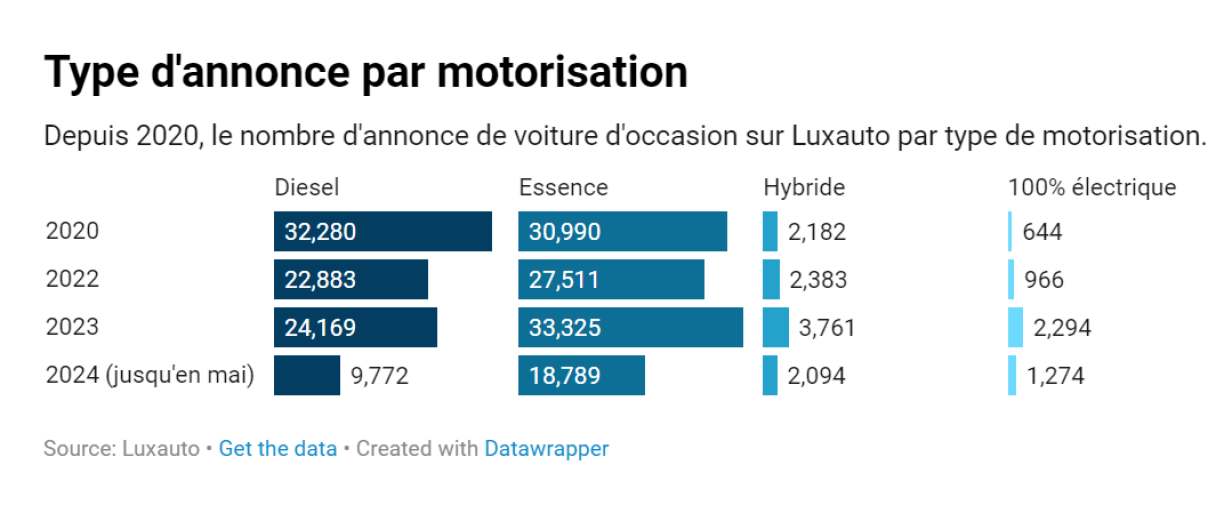 Hybrid an Elektroautoe maachen nëmmen e ganz klengen Deel um Occasiounsmaart aus: sou goufen zejoert 57.000 Bensinn- an Diesel-Ween annoncéiert, iwwerdeem et der nëmmen 6.000 elektrescher oder hybrider waren.